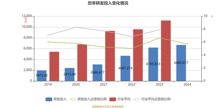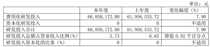 2024年全年,公司研发投入金额为6685.02万元,同比增长7.9%;研发投入占营业收入比例为5.73%,相比上年同期下降0.92个百分点。此外,公司全年研发投入资本化率为0%。
