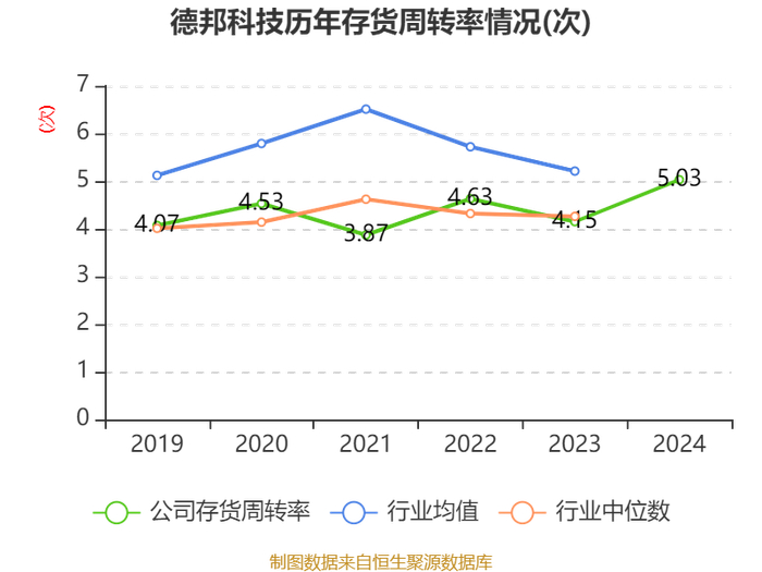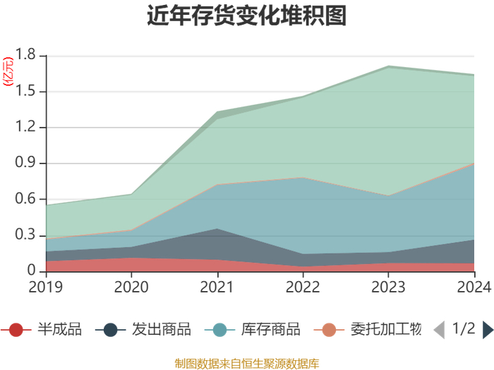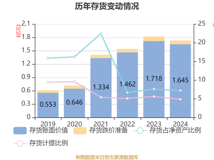 从存货变动来看,截至2024年末,公司存货账面价值为1.64亿元,占净资产的7.17%,较上年末减少727.96万元。其中,存货跌价准备为837.45万元,计提比例为4.84%。