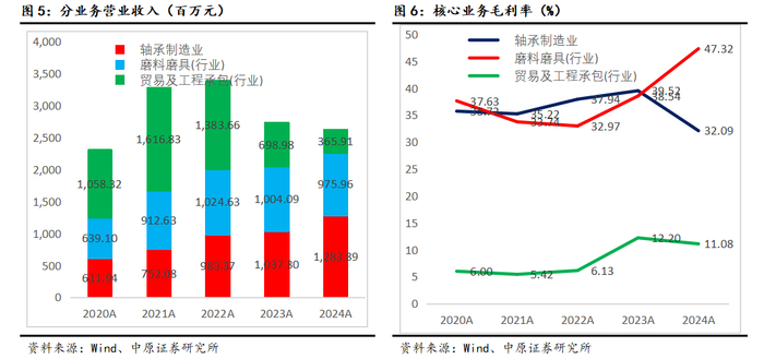 2024年分业务毛利率情况:特种及精密轴承行业毛利率33.59%,同比下滑7.61个百分点;机床工具毛利率58.24%,同比增长0.58个百分点;贸易及工程承包毛利率11.08%,同比下滑1.12个百分点。