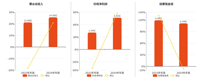 公司营业总收入为14.59亿元。归母净利润为2.52亿元。经营活动现金净流入为4.19亿元,较去年同报告期经营活动现金净流入减少3049.62万元,同比较去年同期下降6.79%。
