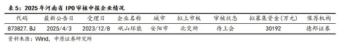 目前,河南申报在审企业仅有1家,为安阳市区的岷山环能,目前状态为待上会,拟在北交所上市,拟融资规模为3.02亿元。