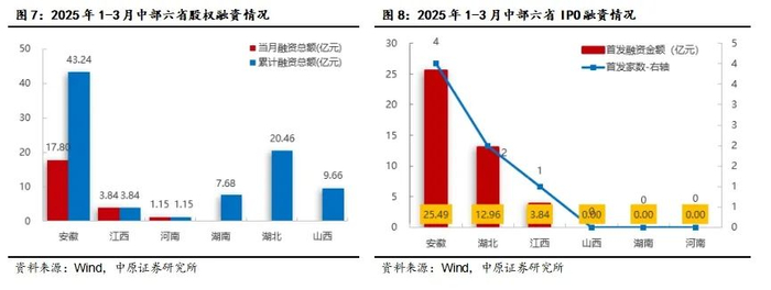 对比中部六省股权融资规模和数量,3月份,安徽省有2家公司IPO上市、江西省1家公司IPO上市、河南1家公司完成增发融资。1-3月份,安徽有5家公司合计融资43.24亿元,居六省第一;湖北有3家公司融资20.46亿元,居六省第二;山西、湖南、江西、河南分别有1家公司IPO或增发实现融资。