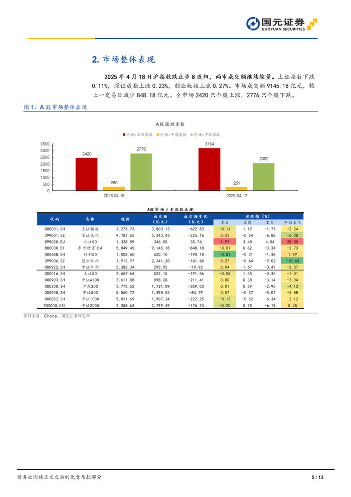 【国元研究】每日复盘:2025年4月18日沪指收跌止步8连阳,两市成交额继续缩量