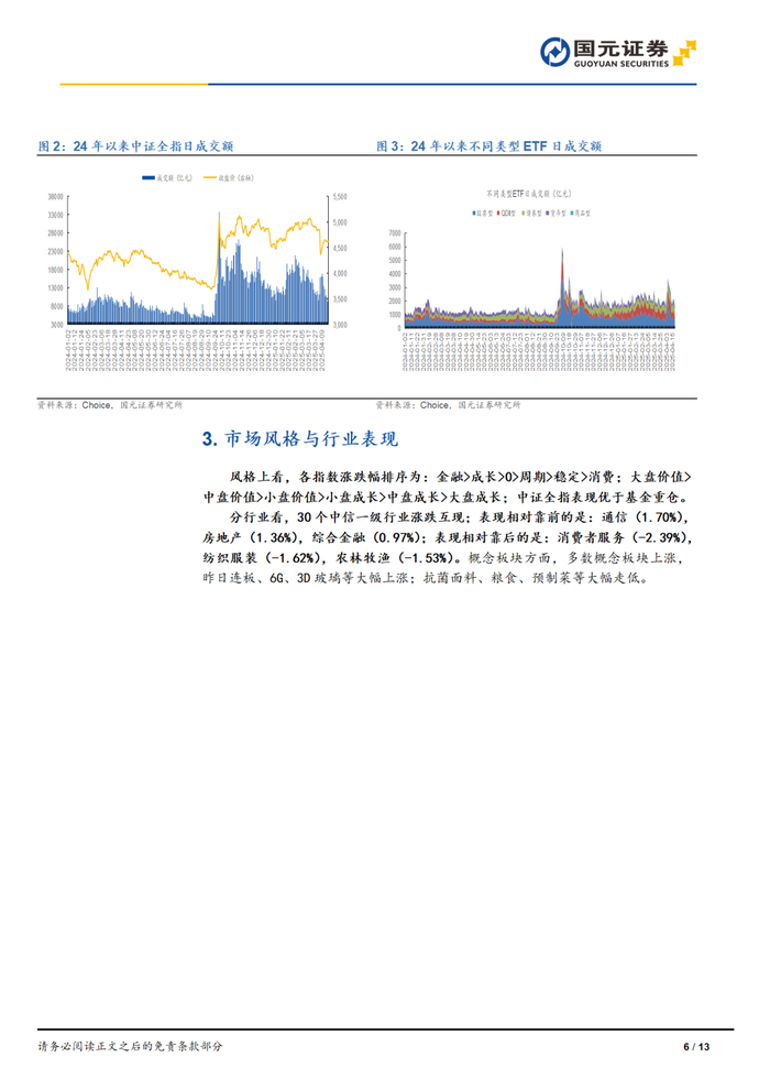风格上看,各指数涨跌幅排序为:金融>成长>0>周期>稳定>消费;大盘价值>中盘价值>小盘价值>小盘成长>中盘成长>大盘成长;中证全指表现优于基金重仓。
