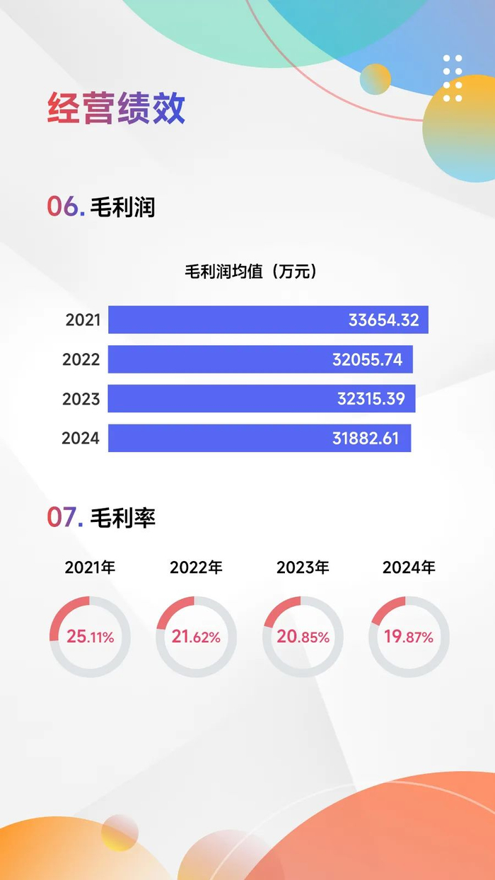 毛利率和净利率持续下探。2024年,百强企业毛利率均值为19.87%,较上年下降0.98个百分点;净利率均值为4.98%,首次降至5%以下,较上年下降0.43个百分点。