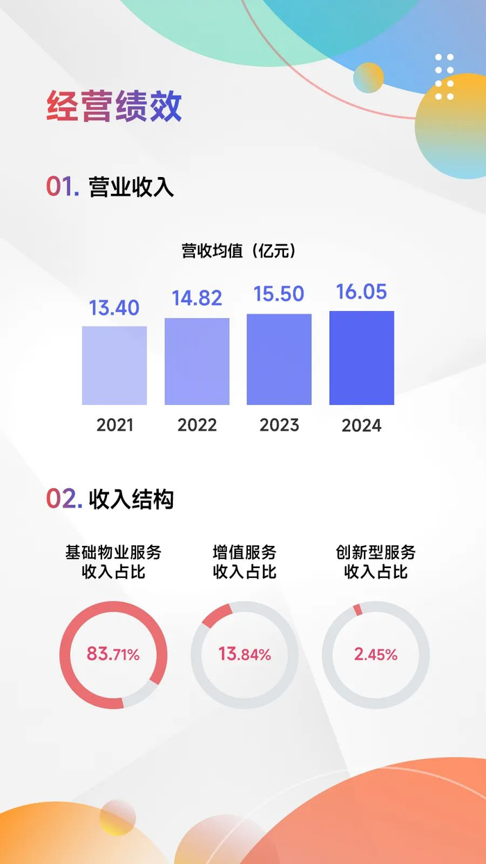 从收入构成上看,基础服务收入占比进一步提升,占据核心地位。2024年,百强企业基础物业服务收入均值为13.43亿元,占比约为83.71%,同比提升1.66个百分点。增值服务和创新服务收入占比均有所下降。2024年,增值服务收入占比13.84%,同比下降1.39个百分点;创新型服务收入占比2.45%,同比下降0.27个百分点。