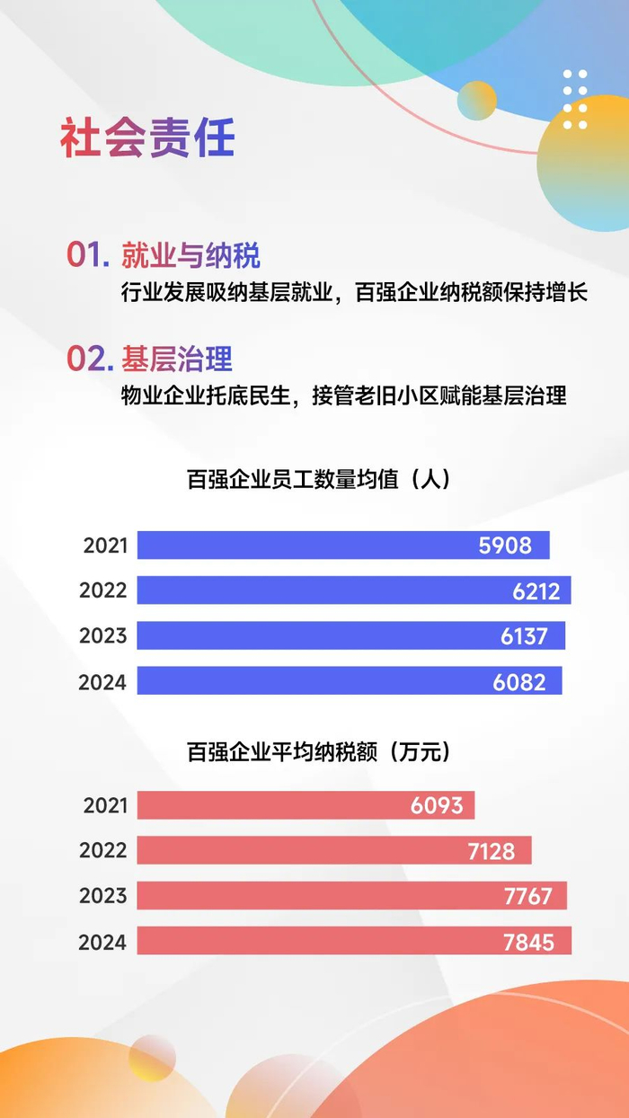 从纳税情况看,百强企业诚信经营,依法纳税,发挥榜样力量。2024年,百强企业平均纳税额7845万元,同比上升1.01%,高于2024年全国税收收入增长率(-3.4%)。百强企业响应国家号召,在赋能基层治理,维护社区稳定等方面发挥重要作用。