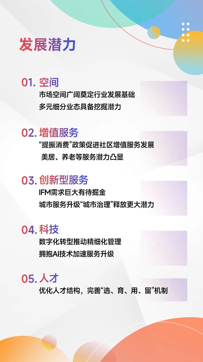 2025年是“十四五”规划的收官之年,也是“十五五”规划的布局之年,物业管理行业在“十四五”期间发生了显著变化,从“市值巅峰”到“理性回归”,从“规模为王”到“绩效优先”,从“增量扩张”到“存量深耕”,从“粗放增长”到“精细运营”,从“地产赋能”到“独立发展”。展望未来,百强企业将根据行业发展趋势制定“十五五”发展策略:品质筑基精益服务,聚焦深耕增强效益,多元融合重塑生态,智慧赋能提质增效,以人为本长效发展。通过务实笃行,实现价值跃升,预祝大家在2025年取得更好的成绩,谢谢大家!