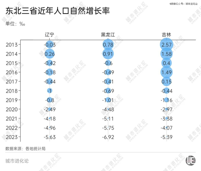 数据显示,2020年之前,东北三省的人口自然增长率均在-1‰上下。但从2020年开始,人口自然增长率负增长趋势不断加剧,到2023年,东北三省的人口自然增长率均下探至-5‰以下,远低于-1.48‰的全国平均线。