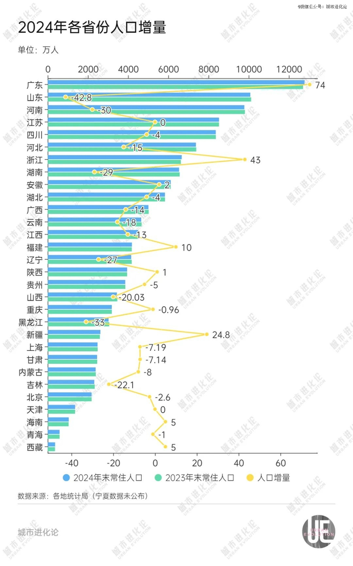 即使有“讨好型市格”哈尔滨的流量加持,黑龙江仍未走出人口负增长的困境。2024年,黑龙江常住人口减少33万人,减少规模仅次于山东(-42.8万人)。