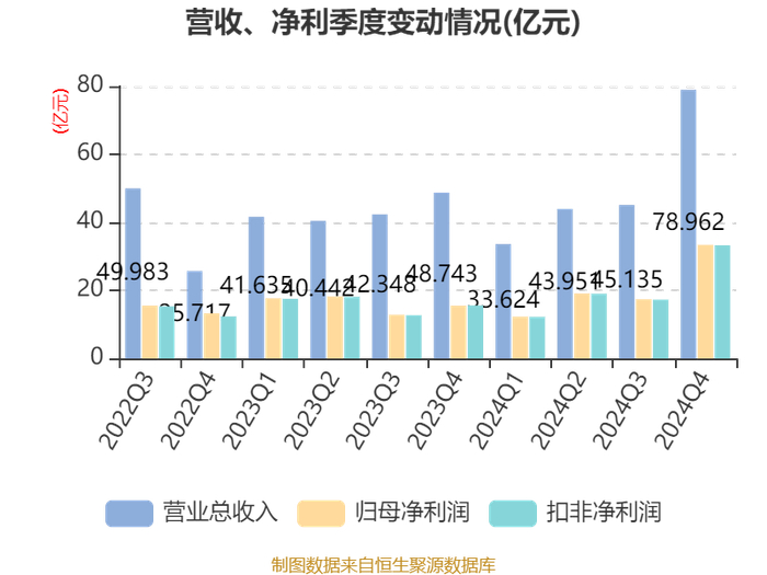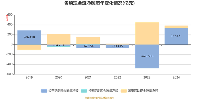 截至2024年,公司经营活动现金流净额为337.47亿元,同比增加816.03亿元;筹资活动现金流净额44.83亿元,同比减少405.8亿元;投资活动现金流净额6602.98万元,上年同期为-1.46亿元。