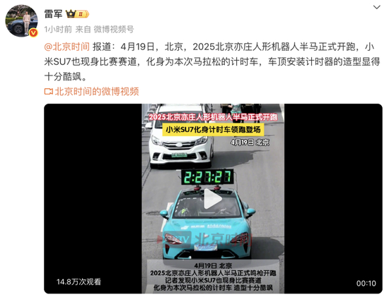今日早间,小米创始人、董事长兼CEO雷军在微博上分享了小米SU7化身马拉松的计时车的相关视频。