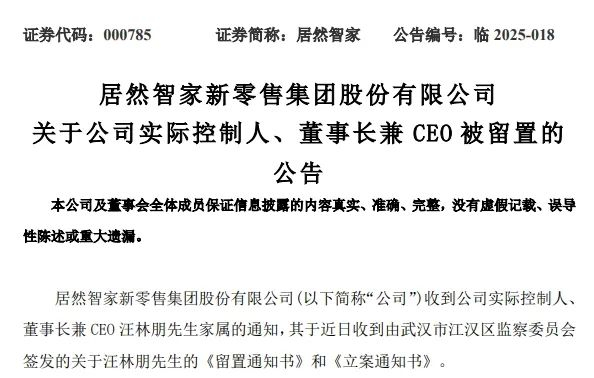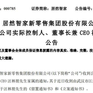 4月18日,居然智家发公告称,公司收到实际控制人、董事长兼CEO汪林朋家属通知,汪林朋近日收到武汉市江汉区监察委员会签发的《留置通知书》和《立案通知书》。