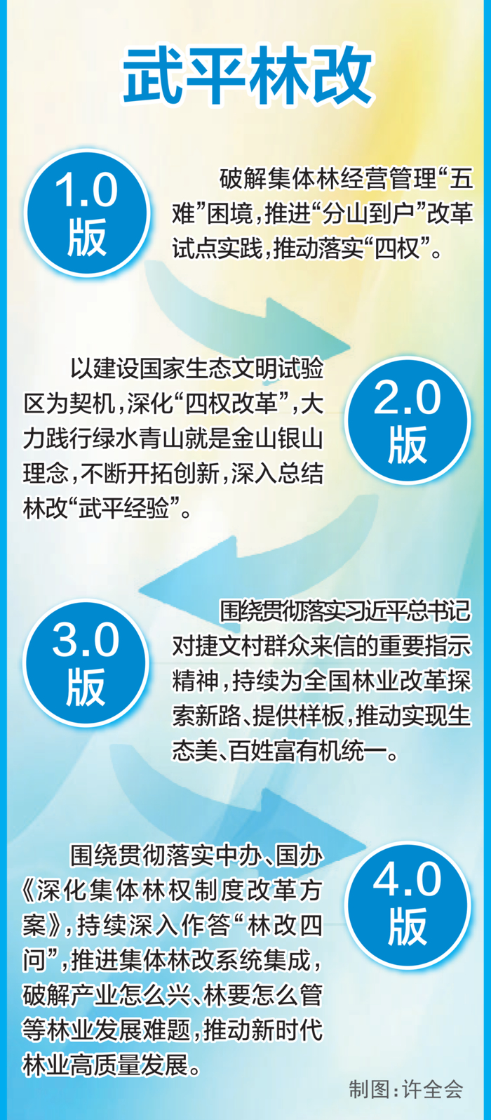 20余年,武平林改从“1.0版”到“4.0版”,增绿、增收协调发展,兴业、富民齐头并进。“我们正推进深化集体林权制度‘三多’改革系统集成试点工作,大胆创新突破,突出重点、攻克堵点、打造亮点、找到支点、夯实落点,加快形成一批可复制可推广的典型经验,坚持在深化集体林改先行区建设中树标杆、作示范。”武平县林业局局长刘俊文说。