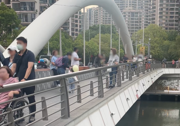 工作日的下午,可以看到天安千树的昌化路桥上,已经挤满了外籍游客,甚至有人在直播,相比“小巨蛋”,这里的游客构成似乎更多元一点,但依然以东南亚籍游客为主。