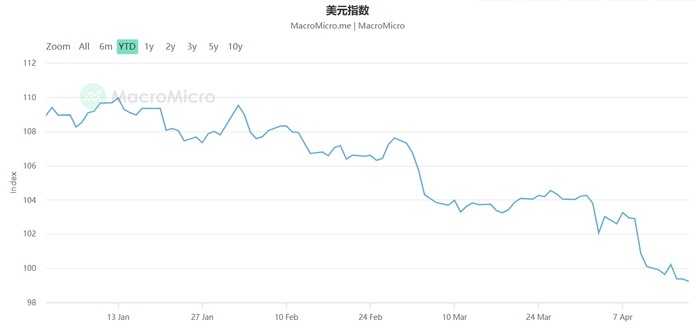 美元指数自1月创下高点以来持续下跌,4月11日盘中更是跌破了关键的100点心理关口,触及99.01点,创2022年年初以来最低水平。本周,美元指数进一步走低,截至发稿,美元指数报99.23。
