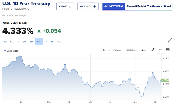 受关税政策影响,美债收益率上周突破了4.5%的关键阻力位,本周收于4.333%,仍处于高位。而且,“债市VIX”指数周中一度飙升至137.26以上,创下年内新高,凸显出投资者对债务前景的不安。