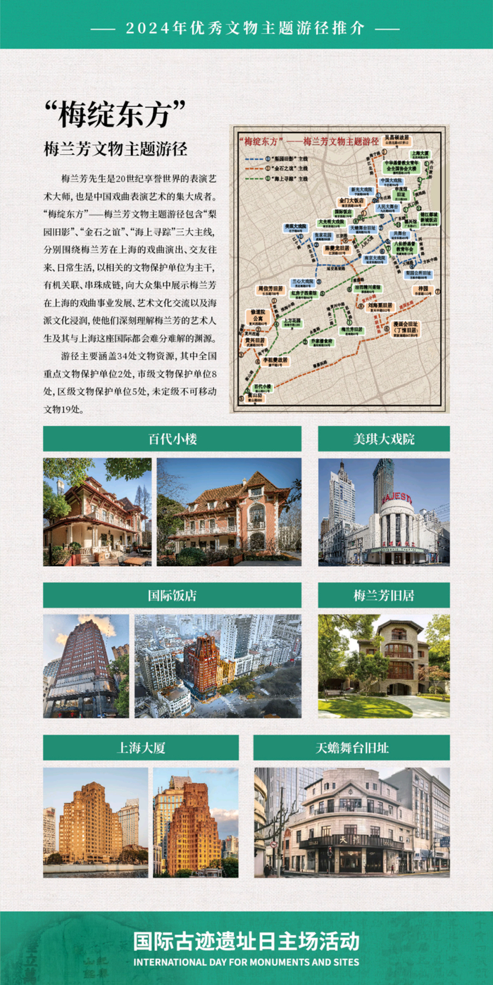市文化旅游局介绍,近日,国家文物局办公室 文化和旅游部办公厅 国家发展改革委办公厅联合印发《关于推介2024年度优秀文物主题游径的通知》,上海报送的“海上方舟·共同家园”文物主题游径以及“梅绽东方”梅兰芳文物主题游径,凭借深厚的文化底蕴、显著的历史价值和科学的规划布局成功入选,4月18日在国际古迹遗址日主场活动上正式发布。接下来,让我们一同深入探寻这两条游径的独特价值与魅力所在↓