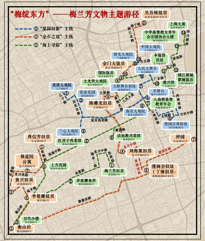 “梅绽东方”梅兰芳文物主题游径包含“梨园旧影”、“金石之谊”、“海上寻踪”三大主线,分别围绕梅兰芳在上海的戏曲演出、交友往来、日常生活。涉及34处不可移动文物,其中全国重点文物保护单位2处,上海市文物保护单位8处,区级文物保护单位5处,未定级不可移动文物19处。