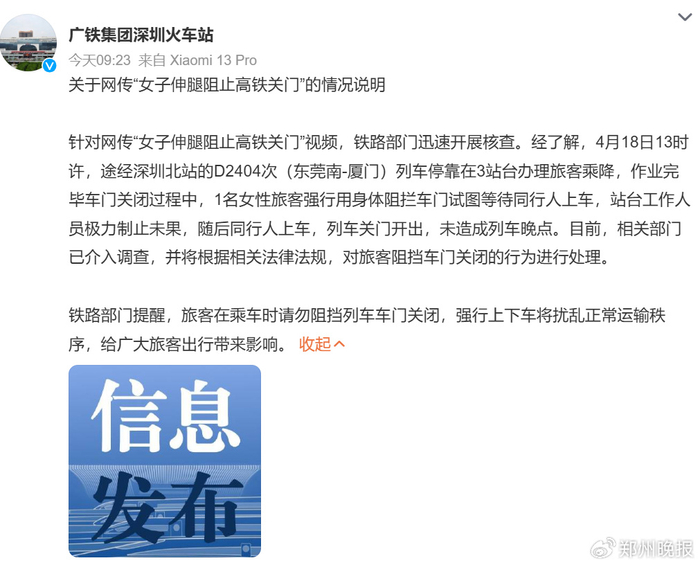 4月19日,广铁集团深圳火车站:关于网传“女子伸腿阻止高铁关门”的情况说明。