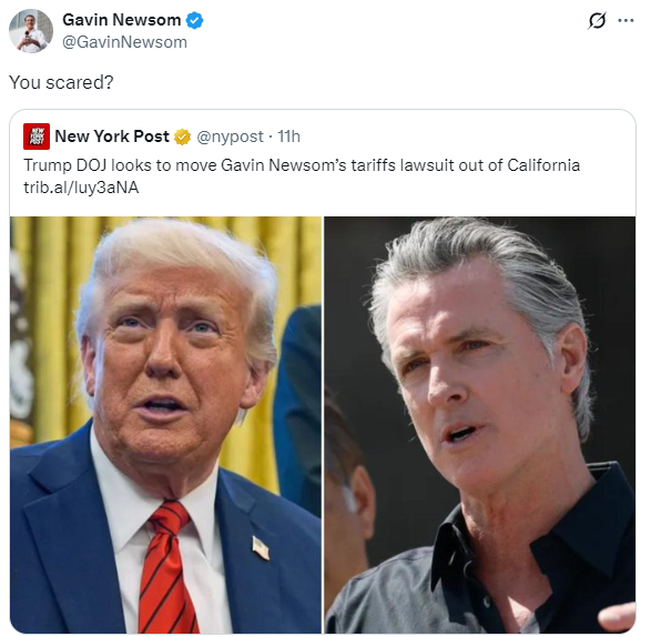 18日,美国加州州长加文·纽森在社交媒体上发声,他转发了一则《纽约邮报》的新闻消息。这则新闻标题为《特朗普的司法部似乎希望把纽森关税诉讼的审理地挪出加州》。纽森在转发消息时附加了一句评论:“你害怕了吗?”