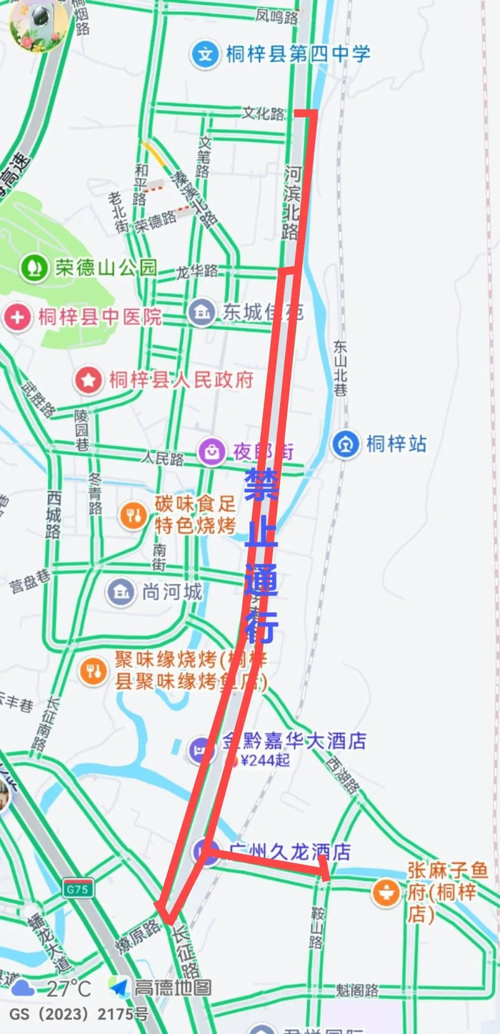 4.16KM及5KM赛道管制期间,河滨大道实施双向管控,从北大门进城的车辆绕行玉龙路、和平路方向;从桐梓高速收费站方向进城的车辆绕行官渡河医院方向,龙华路、人民路、播川路(荣兴大厦)、西湖路等沿线道路车辆禁止驶入河滨大道;需前往小西湖景区的车辆绕行G352国道火电厂方向。