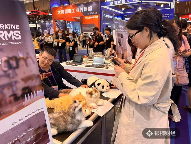 路过大象机器人的展位,不少客商因为米塔猫、米塔狗、米塔熊猫的可爱而驻足,这些机器宠物有逼真的高仿真毛绒,摸上去十分柔软。林佩霓介绍,“宠物”内部搭载多个传感器,如麦克风、触摸传感器、平衡陀螺仪等,同时还有人工智能技术的加持。目前,这些机器宠物可以进行对话、抚摸等简单的互动。“这些产品是为老年人、独居人士设计的,主要是提供陪伴。”林佩霓补充道。