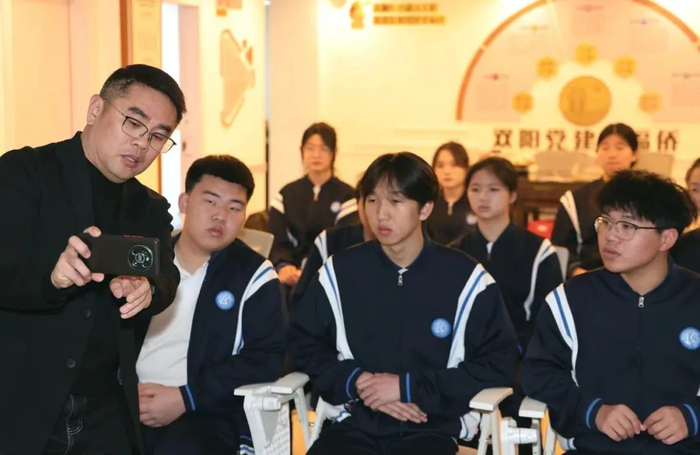 泉州市青年摄影家协会会长陈英杰(左一)与学生分享摄影技巧