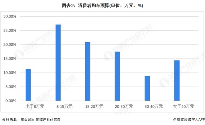调研数据显示,中端价位仍然是消费者最关注的市场,消费者预算集中在8-20万元左右,预算超30万元的消费者比例约30%。