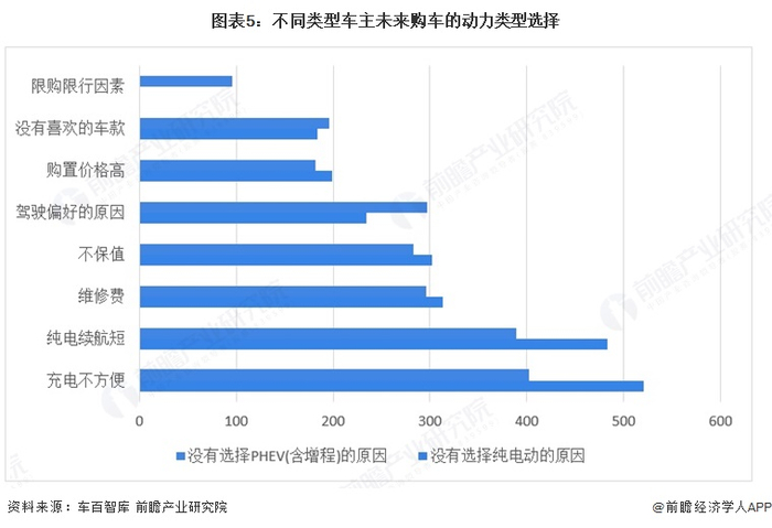 据调查显示,消费者未选择PHEV(含增程)的原因主要包括:充电不方便、纯电续航短、维修费昂贵和不保值等原因。