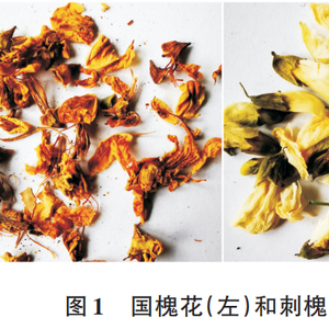 国槐花的树枝上没有刺,国槐花呈棕黄色,皱缩而卷曲,花瓣多散落,开花呈钟状,颜色为黄绿色,旗瓣阔心形,味较淡微苦,沸水浸泡后,溶液呈褐色。