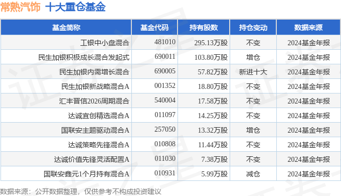 持有常熟汽饰最多的基金为工银中小盘混合,目前规模为10.03亿元,最新净值2.575(4月18日),较上一交易日下跌0.08%,近一年上涨11.86%。该基金现任基金经理为李昱。
