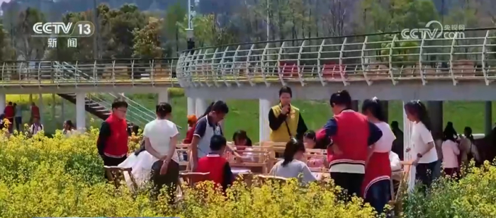 走进杭州市溪口村,青山如黛,连片的油菜花灿烂绽放,仿佛打开了一幅动态的春日画卷。在户外花田体验区,孩子们专注体验古法织布,细密的棉线在指尖慢慢成形。