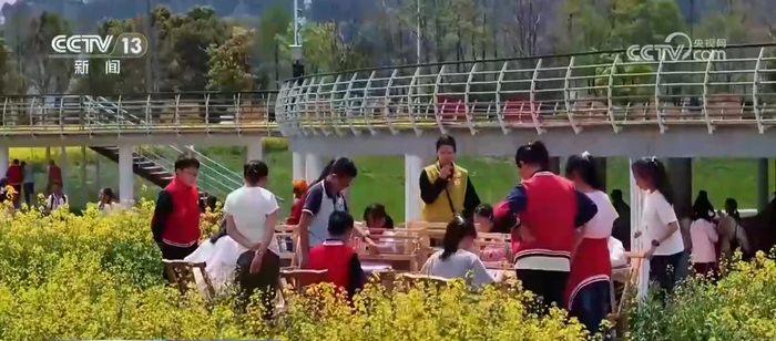 走进杭州市溪口村,青山如黛,连片的油菜花灿烂绽放,仿佛打开了一幅动态的春日画卷。在户外花田体验区,孩子们专注体验古法织布,细密的棉线在指尖慢慢成形。