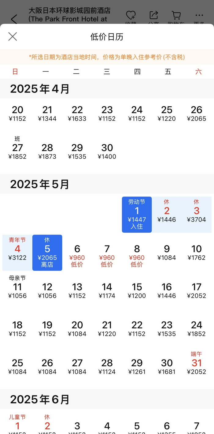 以大阪为例,大阪日本环球影城园前酒店5月3日的客房最低价格为3704元,与5月6日的960元相比,价格涨幅约286%;而大阪环球影城附近的环球影城东方酒店5月3日的客房最低价格为3983元,与5月6日的559元相比,价格涨幅高达613%。