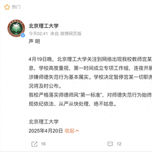 4月19日晚,北京理工大学关注到网络出现我校教师宫某涉嫌师德失范行为的举报信息,学校高度重视,第一时间成立专项工作组,连夜开展调查工作。经初步核查,宫某涉嫌师德失范行为基本属实。学校决定暂停宫某一切职务活动,后续核查结果、处置情况将及时公布。