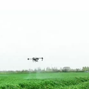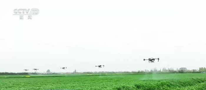 在安徽定远县的一处麦田里,在记者身后田间地头里正在加紧开展喷灌作业缓解旱情。目前,这里的小麦已经进入到了抽穗扬花期,能看到这片麦田里的麦穗长得比较长,穗粒数比较多,这说明小麦前期水肥管理到位。此时也是小麦赤霉病等多种病虫害防控的关键时期,为确保小麦稳产高产,现在需要开展“一喷三防”作业。在记者身旁的这块区域,之前已经完成过灌溉了,今天开展的是利用植保无人机喷洒叶面肥以及防治病虫害的一个工作,像这样一台无人机一天就能完成500亩麦田的防治任务。
