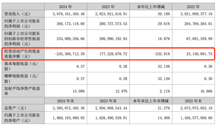但是,新华都2024年经营活动产生的现金流量净额大幅下降232.81%至-2.35亿元,变成了负现金流。公司解释,经营活动产生的现金净流量较同期减少主因销售增加,采购货款预付的现金流相应增加。