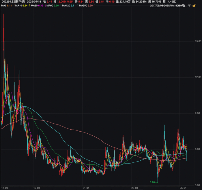 从股价走势来看,在2017年9月阿里入股后,新华都的股价在复牌后一个月左右从8元/股左右飙升至17元/股上方,一度实现市值翻倍;但是近几年来该股调整幅度也很大,还在2024年上半年一度跌至3.26元/股的低位;2025年以来,新华都曾在2月涨至7元/股上方,但此后最低跌至5元/股左右,最新又回升至6元/股左右。该股今年上涨4.21%。