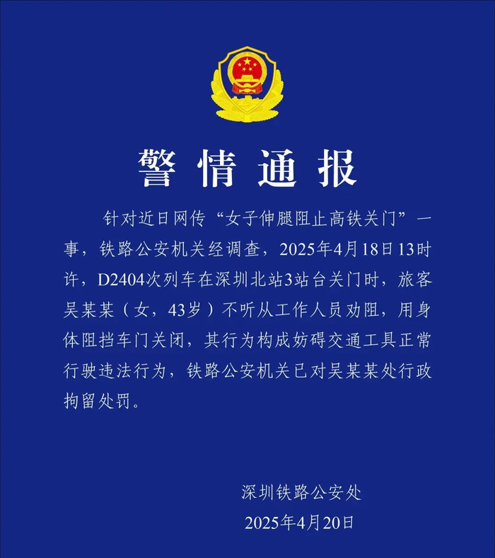 今天(20日),深圳铁路公安处发布警情通报:旅客吴某某(女,43岁)不听从工作人员劝阻,用身体阻挡车门关闭,其行为构成“妨碍交通工具正常行驶”违法行为,已被行政拘留。