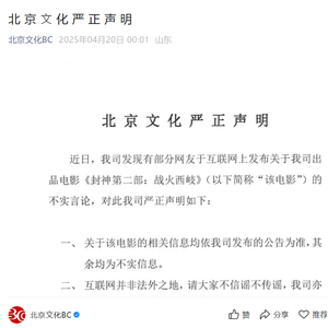 4月20日,据“北京文化BC”微信公众号,近日,公司发现有部分网友于互联网上发布关于公司出品电影《封神第二部:战火西岐》(简称“该电影”)的不实言论,对此北京文化严正声明,关于该电影的相关信息均依北京文化发布的公告为准,其余均为不实信息。