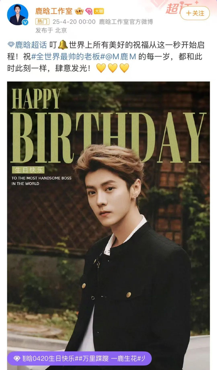 与此同时,演员邓超、陈赫等人率先发文为鹿晗庆生。4月20日0点,邓超晒出合照并送上生日祝福。陈赫也发布与鹿晗的合影,配文“鹿,生日快乐”。