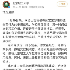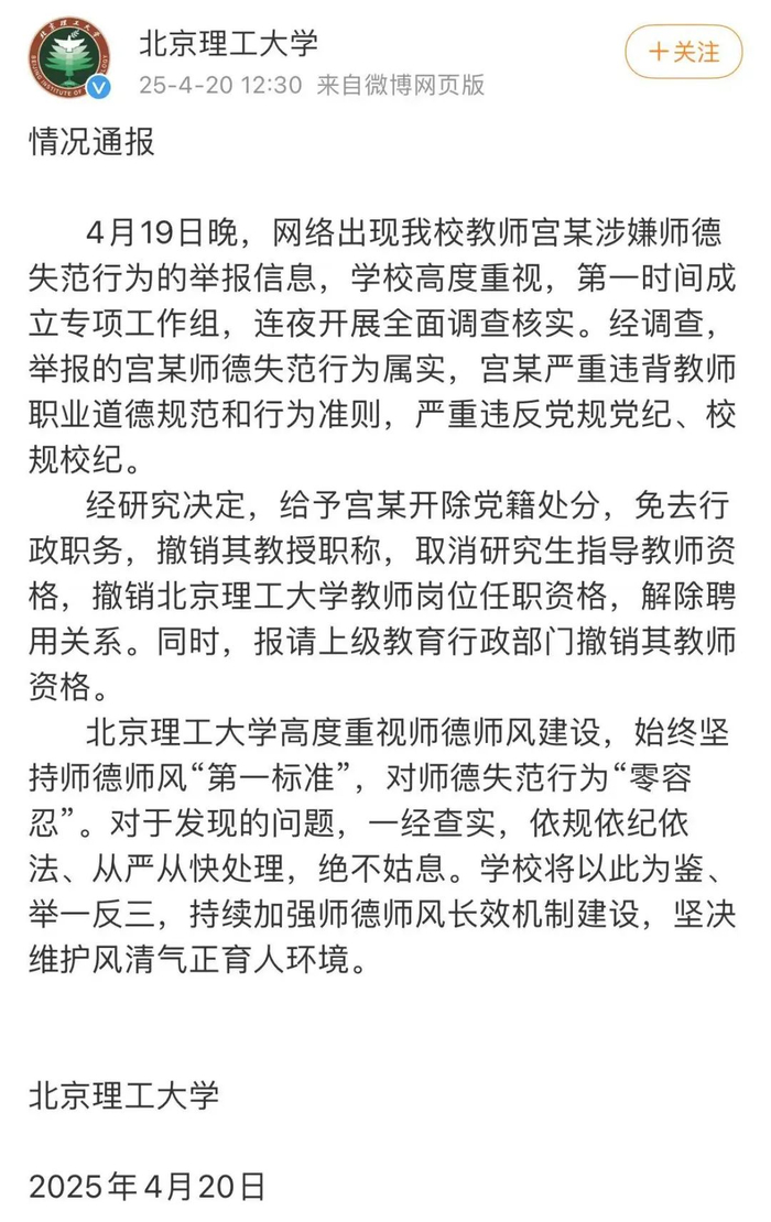 北理工再通报:开除宫某党籍,解除聘用关系