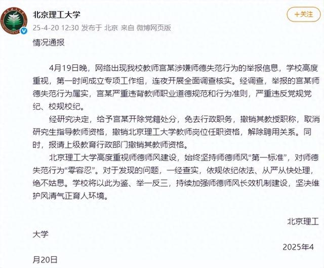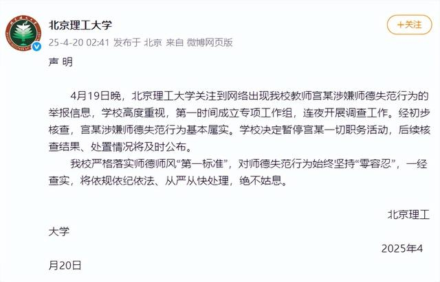 北京理工大学通报:宫某涉嫌师德失范行为基本属实,已被暂停一切职务活动