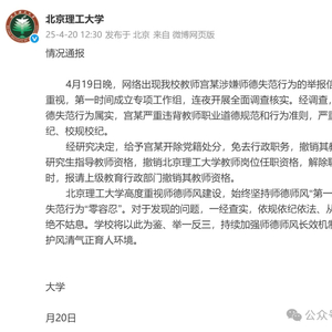 北京理工大学高度重视师德师风建设,始终坚持师德师风“第一标准”,对师德失范行为“零容忍”。对于发现的问题,一经查实,依规依纪依法、从严从快处理,绝不姑息。学校将以此为鉴、举一反三,持续加强师德师风长效机制建设,坚决维护风清气正育人环境。