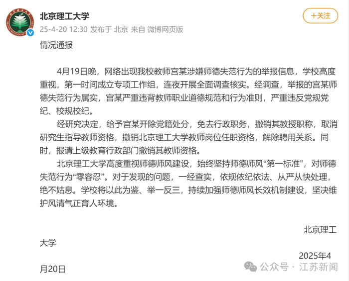 4月20中午,@北京理工大学 再发通报:4月19日晚,网络出现我校教师宫某涉嫌师德失范行为的举报信息,学校高度重视,第一时间成立专项工作组,连夜开展全面调查核实。经调查,举报的宫某师德失范行为属实,宫某严重违背教师职业道德规范和行为准则,严重违反党规党纪、校规校纪。