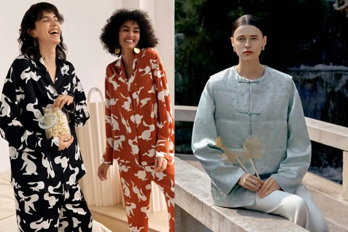 “丝所”真丝家居服(左)用来悦己,新中式苏锦面料的马甲和外套(右),图案有寓意着节节高升的翠竹,以及在林间飞舞的喜鹊,寓意锦绣富足。