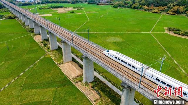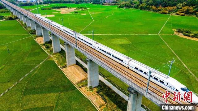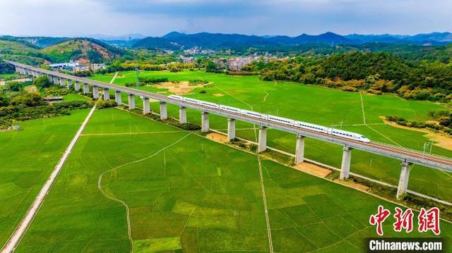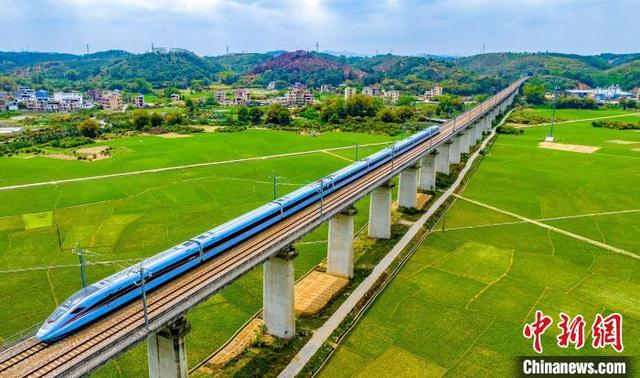 4月19日,广西梧州市龙圩区龙圩镇念村境内,一列动车组从绿色的田园中疾驰而过,与民居、河流、青山、道路相映成景,构成一幅美丽的春日画卷,美不胜收。何华文 摄