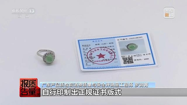 广东产品质检院消费质量与安全评测室工程师 罗润箐:如今市面上流通的翡翠品种繁杂,导致鉴定证书存在一定的造假乱象。比如不法商家可能会仿照正规鉴定机构的证书样式,自行印制出正规证书版式,同时盗用真实机构编号生成虚假电子档案,制作出外观极为逼真的假证书,导致普通消费者很难辨别真伪。