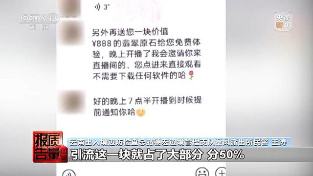 云南出入境边防检查总站德宏边境管理支队章凤派出所民警 王涛:货主和主播是拿固定工资,平均每月5000元左右,还有1%的抽成,剩下的就由组织者和客服进行分成。引流占了大部分,分50%,因为只有把客户引过来才有后续的分成。